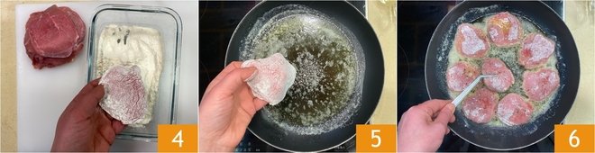 Next, dredge each slice in flour, pressing lightly and shaking off the excess 4. Place the cutlets in the hot pan 5 and brown them over medium-high heat for a few minutes on each side until golden 6; during cooking, season with salt and pepper to taste.