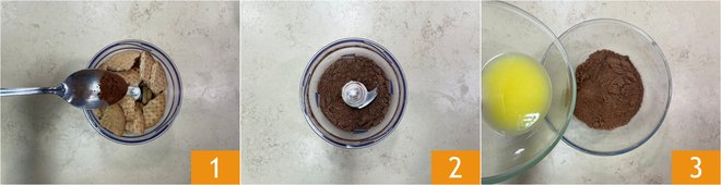 To prepare the Valentine's Day cheesecake, start with the base: melt the butter in a saucepan over low heat and let it cool. In a mixer, add the dry cookies and cocoa powder 1 and blend until powdered 2. Pour the mixture into a bowl and add the melted butter 3.
