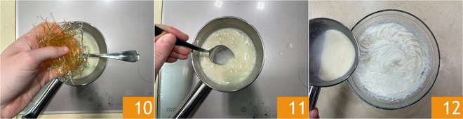 In a saucepan, pour the 2 tablespoons (30 g) of fresh liquid cream and bring it to a boil, then turn off the heat and add the previously soaked gelatin 10. Stir 11 and let cool. Once cooled, add it to the mixture of cream, mascarpone, and cream cheese 12 and mix.