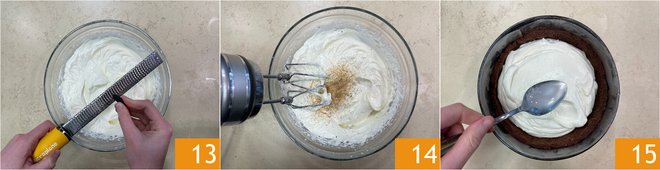 Grate the tonka bean 13 and mix again with the whisk 14. Meanwhile, the base will have solidified, so take it and pour the filling inside the shell. Level the cream 15 and let it firm again in the fridge for at least 40 minutes.