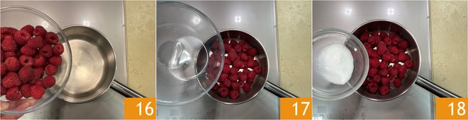 Move on to the coulis: soak the gelatin in cold water. Meanwhile, in a saucepan, add the raspberries 16, water 17, and sugar 18.