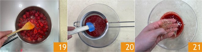 Turn on the heat to medium intensity, stirring occasionally 19. When the raspberries have wilted, strain the mixture 20, then add the drained and squeezed gelatin 21. Stir.