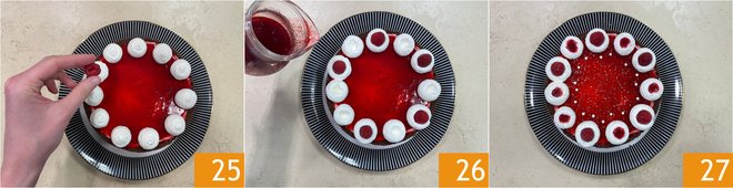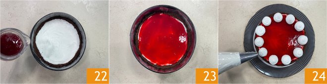 When the cake is well set, cover the surface with the coulis, leaving aside about 1/4 cup (50 g) 22. Place the dessert in the fridge for about 10 minutes 23. Whip the remaining 1/3 cup (70 g) of fresh cream for decoration and pour it into a piping bag with an 18 mm plain nozzle. When the coulis has set, gently remove the cake from the mold and place it on the serving dish. Decorate with whipped cream dollops 24.