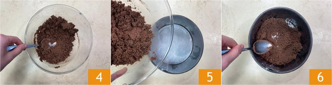Mix well with a spoon to combine the mixture 4. Line a 6.5-inch diameter (4-inch height) springform pan with parchment paper; for the edges, you can use a strip of acetate. Pour the cookie mixture 5 and compact it with the back of a spoon to create a 3-inch high edge 6. Let it solidify in the fridge for at least 20 minutes.