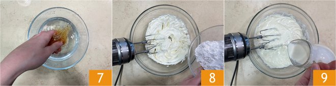 Meanwhile, prepare the filling: soak 14 g of gelatin sheets in cold water 7. In a bowl, work the mascarpone with the cream cheese with a whisk, then add the powdered sugar 8. Also add the fresh liquid cream, keeping aside 2 tablespoons (30 g) to dissolve the gelatin 9. Continue to work with the whisk until the cream is semi-whipped: at this point, the mixture will be consistent, smooth, and shiny.