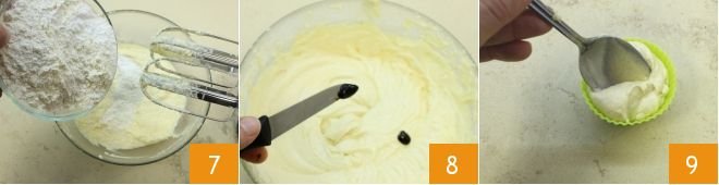 and add the dry ingredients to the mixture 7. At this point, flavor with the seeds from half a vanilla pod 8. The muffin batter is ready, distribute the batter into 8 silicone molds suitable for microwave cooking 9.