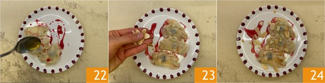 Drizzle them with the liquid from the canned cherries and honey 22. Finally, garnish with almond flakes 23. Your vareniki with cherries are ready to be served 24!