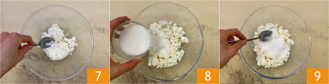 Meanwhile, prepare the filling: in a bowl, place the tvorog and mash it with a spoon or fork 7, then add the sugar 8 and mix 9. Taste to adjust the sweetness to your liking.