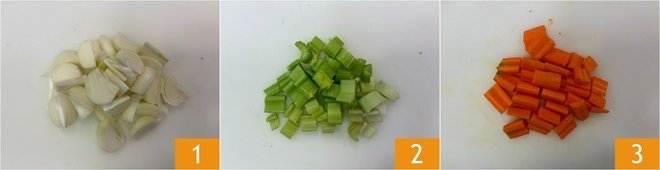 To prepare the pot roast, first peel the onion and slice it 1. Peel the celery and cut it into pieces about an inch long 2; do the same with the carrots 3.