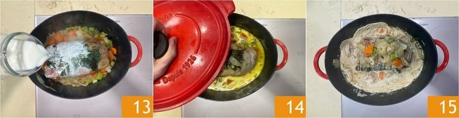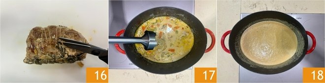 Let it flavor, then pour in the milk 13 and cover with a lid 14. Let it cook for 40 minutes on low heat 15, occasionally turning the roast.