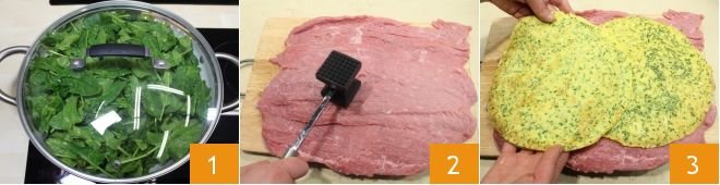then evenly distribute the already cooked spinach 4 and the slices of cooked ham 5. Roll the veal from the shorter side 6