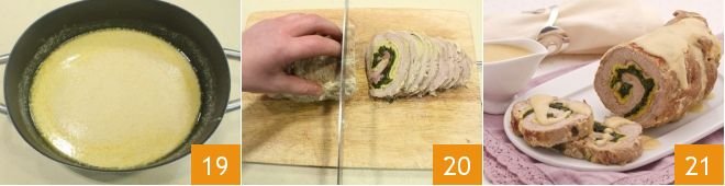 to obtain a homogeneous cream 19 with which you will drizzle the slices of roll. If the cream is too liquid, you can thicken it in a large pan, adding if necessary, 1 tablespoon of flour dissolved in a little cold water. Cut the veal roll with milk into slices 20 and serve it accompanied by the cooking juice 21.