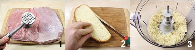 To prepare the veal roll with vegetables, pound the meat with a meat tenderizer 1 and remove any fat or cartilage, then salt and pepper the surface. Prepare the meat filling: take the bread, remove the crust with a knife 2, reduce it to crumbs with a mixer, and transfer it to a large bowl 3.