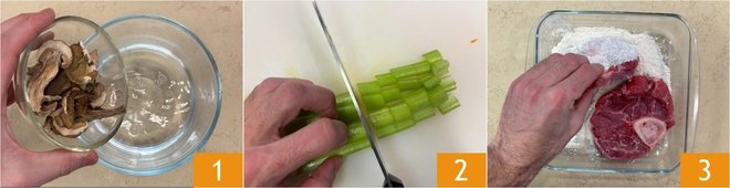 To prepare the veal shank croquettes, first rehydrate the dried mushrooms in warm water for about 15 minutes 1. Meanwhile, clean and roughly chop the celery 1, carrot, and onion. Now flour the veal shanks on both sides 3.