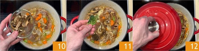 Also add the drained dried mushrooms 10, sage, and a few rosemary needles 11. Cover with the lid 12 and bake in a preheated static oven at 340°F for about 80 minutes (if you used a pot not suitable for oven cooking, you can transfer everything to a baking dish before adding the broth, mushrooms, and herbs).
