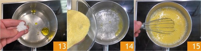 In the meantime, you can start on the polenta: pour the water, oil, and salt into a pot 13. Bring to a boil, then add the cornmeal in a rain 14 and mix well with a whisk 15.