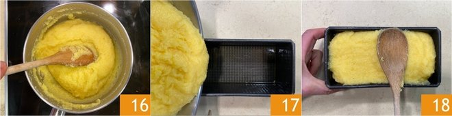 Cook over low heat for about 45 minutes, stirring occasionally, until thickened 16. Once ready, transfer the polenta to a mold 17 and level the surface 18. Cover with plastic wrap and let cool completely at room temperature.