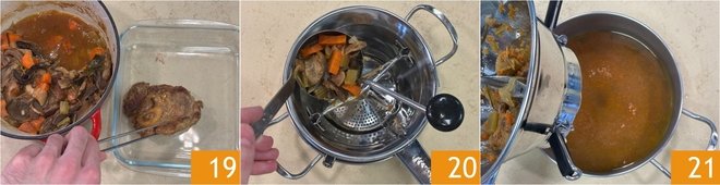 After the meat's cooking time has passed, remove the veal shanks from the pot and set them aside 19. Pass the cooking juices with the vegetables through a food mill 20 to obtain a sauce 21.