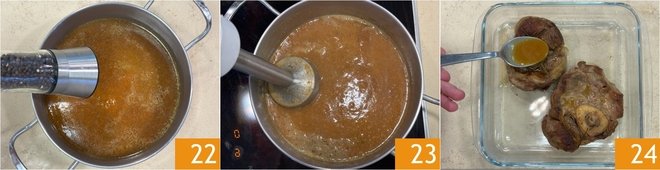 Season the sauce with salt and pepper 22 and return it to the heat to warm it up. You can blend it further with an immersion blender to achieve a smoother, more homogeneous consistency 23. Coat the veal shanks with the hot sauce 24.