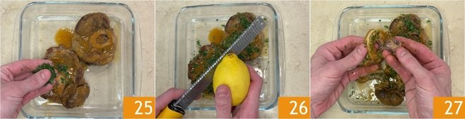 Fragrance with finely chopped parsley and rosemary 25 and grate the lemon zest 26, then let cool completely. Once cooled, extract the marrow 27.
