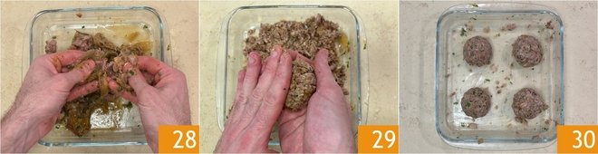 Finely shred the meat with your hands 28 and mix it with the marrow to obtain a homogeneous mixture. Take a portion of the mixture and compact it between the palms of your hands to form a meatball 29. You need to make 4 meatballs of the same size 30.