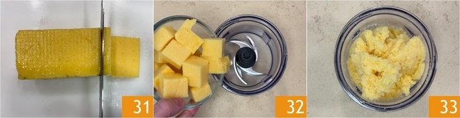 Set aside the meatballs and retrieve the now cooled polenta. Cut the polenta into cubes 31, then place them in a food processor 32 and blend to obtain a soft mixture 33.