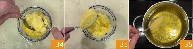 In a small pot, heat the seed oil to 340°F. Use 2 spoons 34 to shape quenelles 35, then immerse them in the hot oil 36 and fry until golden; it will take about 4-5 minutes.