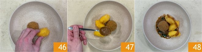 You are ready to plate: on each plate, place one veal shank croquette and 3 polenta quenelles 46. Drizzle with the remaining veal shank sauce 47 and finish with a few drops of parsley oil. Serve your veal shank croquettes immediately 48!