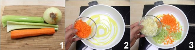 To prepare the veal stew with mushrooms, wash, clean, and finely chop an onion, a carrot, and a celery stalk 1. In a rather large non-stick pan, place 5 tablespoons of extra virgin olive oil and sauté the carrot 2, celery, and onion 3.
