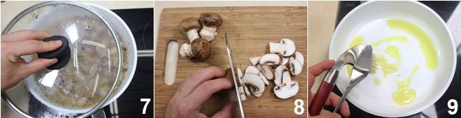 covering the pan with a lid and leaving a small vent 7. During cooking, add meat or vegetable broth when needed. In the meantime, clean, peel, and slice the champignon mushrooms 8. Place two tablespoons of oil and one (or two, depending on taste) crushed garlic clove in a pan 9.