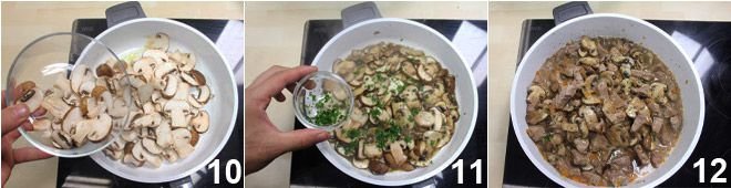 Then add the mushrooms 10 and let them cook over high heat for a few minutes, adding the finely chopped parsley 11. Five minutes before the end of the meat's cooking, add the mushrooms directly to the stew pan, stir gently, and finish cooking, adjusting the salt and pepper 12. Serve the veal stew with mushrooms accompanied by fresh bread, mashed potatoes, or, in winter, steaming polenta.