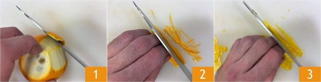 Blanch the peels for 2 minutes in boiling water 4, then drain well 5 and transfer to a bowl 6. Squeeze all the citrus fruits and set the juice aside.