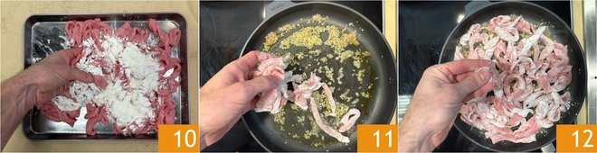 Mix to coat the veal strips well 10. Add them to the pan 11 and sauté for a few more minutes 12.