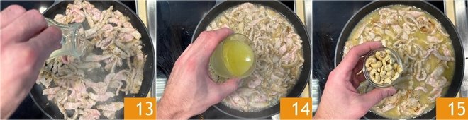 Salt, pepper, and deglaze with the wine 13. Once it has evaporated, add the citrus juice 14 and the cashews 15.