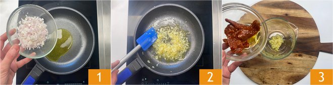 To prepare the veg roast, clean and finely chop the shallot, then gently sauté it with a drizzle of oil in a pan 1 2. Once softened, pour it into the cup of an immersion blender and add the drained sun-dried tomatoes 3.