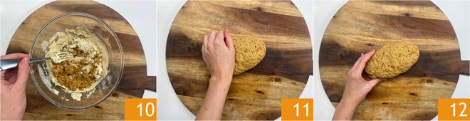 Mix until you get an elastic dough 10. When the dough has compacted, transfer it to a work surface, knead it briefly, and shape it into a small loaf with a slightly oval shape, like a mini roast 11 12.