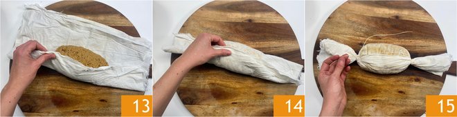 Place the loaf on a perfectly clean natural fiber cloth 13 and wrap it loosely 14, twisting the ends like a candy and tying them with a string 15.