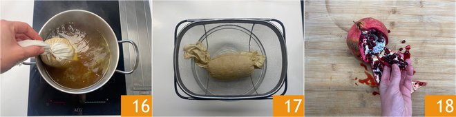 Bring a pot with vegetable broth and soy sauce to a light boil, immerse the roast wrapped in the cloth, and cook for about an hour. After this time, drain and let cool slightly 17. In the meantime, prepare the pomegranate sauce: deseed the pomegranate 18.