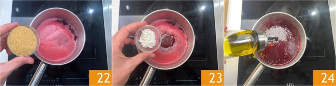 Add brown sugar 22 and cornstarch 23 to the juice. Mix with a whisk and let it thicken over low heat for a few minutes, stirring with a whisk. When it starts to thicken, add the oil 24 and continue to emulsify. Turn off the heat and set aside.