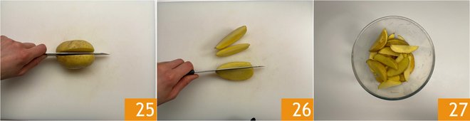 Take the potatoes, wash them, and cut them first in half 25 and then in quarters, without peeling them 26 27.