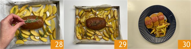 Take the mini roast: place it on a baking sheet lined with parchment paper, then add the potatoes, garlic, and rosemary 28. Brush the mini roast generously with pomegranate sauce, making sure to keep some aside for plating. Also season with salt, pepper, and oil, and cook in a preheated static oven at 392°F for about 35-40 minutes, placing the baking sheet in the center of the oven. If towards the end of cooking the roast is darkening too much while the potatoes still need a few more minutes to brown, you can cover it with aluminum foil. Once ready, remove from the oven and serve the veg roast in slices, topped with pomegranate sauce and accompanied by roasted potatoes, garnished as desired with pomegranate seeds 30!