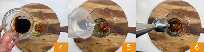 Pour in the soy sauce 4 and lukewarm water 5, then blend thoroughly 6.