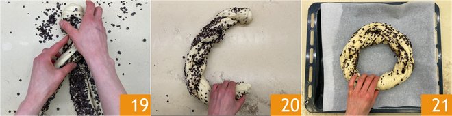 Braid the two dough strands 19. Join the ends to form a circle 20 and place it on a baking sheet lined with parchment paper 21. Let it rise for 1 hour in the turned-off oven with the light on.