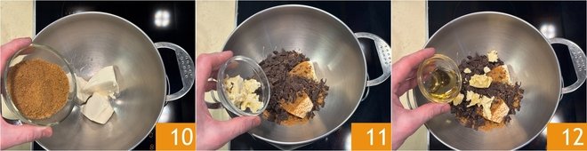 Now focus on the ganache: in a double boiler, combine the silken tofu, raw cane sugar 10, chopped chocolate, cocoa butter 11, and agave syrup 12.