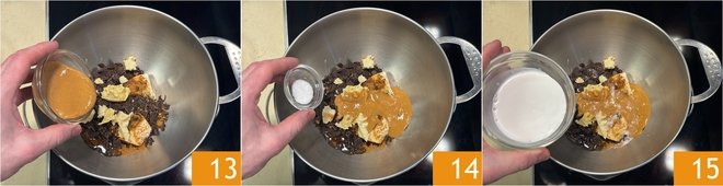 Add also the peanut butter 13, salt 14, and coconut milk 15.