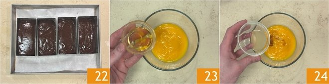 Emulsify with an immersion blender 19 to make the ganache smooth and homogeneous 20. Pour it into the molds 21, then tap the mold to level it and remove any air bubbles.