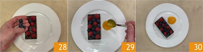 Garnish with fresh blueberries and raspberries 28, add a few sprigs of dill, and pour the mango sauce on the side 29. The vegan chocolate and peanut terrine with berries is ready to be served 30!