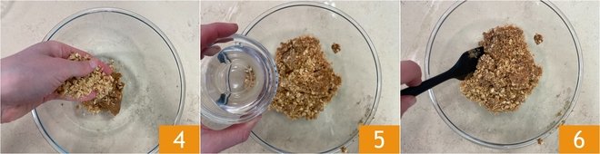 Add the peanuts to the blended date pulp 4, then also add the coconut oil 5 and mix everything with a spatula or by hand 6.