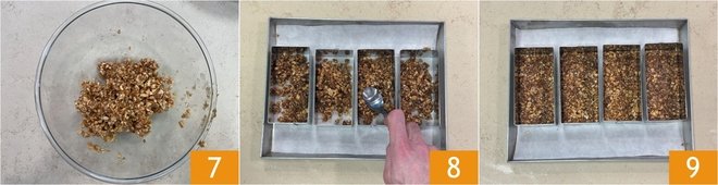 Once you have a homogeneous mixture 7, transfer it to molds and level the base by pressing down firmly with the back of a teaspoon 8. Transfer to the refrigerator for 15 minutes 9.