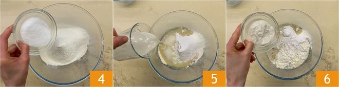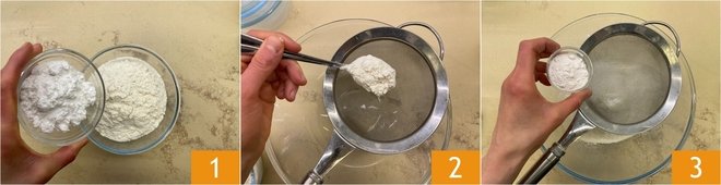 To prepare the vegan dove cake, mix flour and potato starch in a bowl 1, then sift them together 2. Do the same with the baking powder 3.